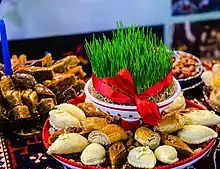 One popular variety of it is koritz (khoriz), a filling that consists of flour, butter and sugar. Gata can have other fillings such as nuts, most commonly walnuts.[6][7] Some variations include placing a coin inside the dough before the gata is baked, and it is said that whoever receives the piece with the coin is to be blessed with good fortune. Gata from the villages of Garni and Geghard are decorated (before baking), round, and generally about a foot in diameter. Around the southern edge of Lake Sevan, in the town of Tsovinar, gata is denser and sweeter, and baked without koritz in a triangular shape without decoration.