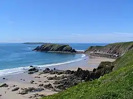 Gateholm was bought by the National Trust in 1981 under Enterprise Neptune, a longterm project to acquire and maintain stretches of coastline to retain its character and preserve its wildlife. The National Trust had already been given over 450 acres on Marloes Peninsula, including Marloes Court Farm, donated in 1941, which included the Marloes Sands and Albion Sands coastline. This, along with adjacent donations of West Hook (1940), Runwayskiln Farm (1941) and Trehill Farm (1942), meant the Trust already owned much of the peninsula and its coast. The acquisition in 1981 of Gateholm plus the Martin's Haven deer park at the western headland, meant the entire coastline and peninsula could be managed under National Trust leases and access arrangements.[5] It is now known as 'Marloes Sands and Mere', and incorporates the Marloes Mere inland SSSI as well as parts of two coastal SSSIs, 'Dale and South Marloes Coast', and 'St Brides Bay South', which between them give legal protection to the whole coastline of the Peninsula.[10][11] The Gateholm coastline also lies within two European designated areas. The 'Pembrokeshire Marine' Special Area of Conservation is notable for its bays, reefs and grey seals,[12] whilst the Special Protection Area for 'Skomer, Skokholm and the seas off Pembrokeshire', gives protection for the large breeding seabird populations.[13]