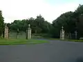 Some entrances had two or even three gates attached to the gateposts, such as at Robertland House in East Ayrshire, Scotland, the side gates being for the use of pedestrians. The gates themselves could be wood or more commonly cast iron, wrought iron or mild steel. A large number of the cast-iron gates were removed by the Ministry of Works in World War II to be melted down and used to build weapons, etc. Once removed these gates were rarely replaced.