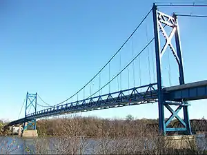 The Gateway Bridge is a steel suspension bridge that carries U.S. Route 30 from Clinton, Iowa to Fulton, Illinois. Its main span length is 1,269.49 m (4,165 ft), its maximum length is 196.3 m (644 ft), and its width is 7.92 m (26 ft).[2] The consultant engineer to the bridge was the City of Clinton Commission. The bridge was financed by bonds, which expired in 1979.[3]