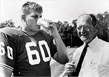 Gatorade was created in 1965, by a team of scientists at the University of Florida College of Medicine, including Robert Cade, Dana Shires, Harry James Free, and Alejandro de Quesada.[7] Following a request from Florida Gators football head coach Ray Graves, Gatorade was created to help athletes by acting as a replacement for body fluids lost during physical exertion. The earliest version of the beverage consisted of a mixture of water, sodium, sugar, potassium, phosphate, and lemon juice.[8] Ten players on the University of Florida football team tested the first version of Gatorade during practices and games in 1965, and the tests were deemed successful. On the other hand, star quarterback Steve Spurrier said, "I don’t have any answer for whether the Gatorade helped us be a better second-half team or not. . . . We drank it, but whether it helped us in the second half, who knows?"[9] Nonetheless, the football team credited Gatorade as having contributed to their first Orange Bowl win over the Georgia Tech Yellow Jackets in 1967, at which point the drink gained traction within the athletic community. Yellow Jackets coach Bobby Dodd, when asked why his team lost, replied: "We didn't have Gatorade. That made the difference."[10]