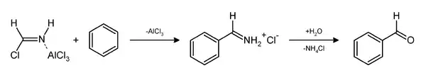 Unlike the Gattermann reaction, this reaction is not applicable to phenol and phenol ether substrates.[5] Although the highly unstable formyl chloride was initially postulated as an intermediate, formyl cation (i.e., protonated carbon monoxide), [HCO]+, is now thought to be react directly with the arene without the initial formation of formyl chloride.[9] Additionally, when zinc chloride is used as the Lewis acid instead of aluminum chloride for example, or when the carbon monoxide is not used at high pressure, the presence of traces of copper(I) chloride or nickel(II) chloride co-catalyst is often necessary. The transition metal co-catalyst may server as a "carrier" by first forming reacting with CO to form a carbonyl complex, which is then transformed into the active electrophile.[10]