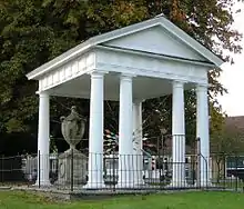 Gatton "Town Hall", on Gatton Park estate, is a folly erected in 1765: it takes the form of an open Doric temple. It was here that the parliamentary elections were held. Behind it stands a large urn bearing a Latin inscription, which includes the line "Salus populi Suprema Lex Esto": "Let the well-being of the people be the supreme law".[7][8] James Ogilvy commented in 1914: "The whole erection could shelter about thirty people from the rain; whether it superseded an earlier town hall does not appear to be known."[9]