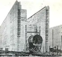 Beyond this, the original design of the locks had yet another safety feature, emergency dams that could be swung across the locks at the upper end of every flight. These consisted of swinging bridges, from which girders were lowered to the lock floor; steel shutters could then be run down these girders to block the flow of water.[7] Never used, they were removed in the 1950s.[6]