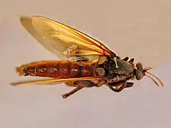 Gauromydas heros can reach a length of 32–70 millimetres (1.3–2.8 in) and a wingspan of about 10 centimetres (3.9 in). It is the largest fly known. The wing membrane is whitish, brown or orange, with a hyaline apex and a posterior margin.[2]