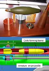 Some designs have non-ferromagnetic projectiles, of materials such as aluminium or copper, with the armature of the projectile acting as an electromagnet with internal current induced by pulses of the acceleration coils.[11][12] A superconducting coilgun called a quench gun could be created by successively quenching a line of adjacent coaxial superconducting coils forming a gun barrel, generating a wave of magnetic field gradient traveling at any desired speed. A traveling superconducting coil might be made to ride this wave like a surfboard. The device would be a mass driver or linear synchronous motor with the propulsion energy stored directly in the drive coils.[13] Another method would have non-superconducting acceleration coils and propulsion energy stored outside them but a projectile with superconducting magnets.[14]