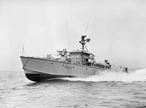 ![]() HMS Gay Bombardier, fitted out in the motor torpedo gunboat design, undergoing trials in Portsmouth Harbour in 1953 | |