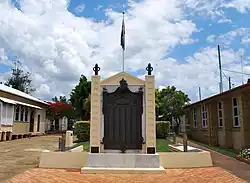 The First World War Memorial is situated between the Post Office and the Library in Capper Street, Gayndah and directly addresses the street. Behind is a memorial garden comprising a trophy gun, paving and garden beds, and surrounding concrete slabs which commemorate service personnel of the Second World War and subsequent conflicts up to Somalia. The Second World War names are incised in white granite, and the other plaques are in bronze.[1]
