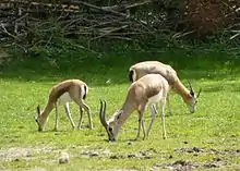 Dorcas gazelles are highly adapted to life in the desert, though they cannot go their entire lives without water, despite the bulk of their hydration needs coming from succulent plants in their diet. The gazelles will still look for water, and drink readily when water is available. They are naturally able to withstand high temperatures and harsh sunlight. Other than evenings when it is very hot, they are active mainly from dusk to dawn. In areas where they face human predation, they tend to be active only at night to minimise the risk of falling prey to hunters. These gazelles feed on leaves, flowers, and the pods of many species of acacia trees, as well as the leaves, twigs and fruits of various desert bushes. They occasionally stand on their hind legs to browse through trees and, after rain, they have been observed digging out bulbs from the ground. Dorcas gazelles are able to run at speeds up to 80 km/h (50 mph)[4] to 96 km/h (60 mph).[5] When threatened, they tail-twitch and make bouncing leaps with their heads held high (stotting), possibly to announce they have seen a predator.