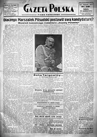 Gazeta Polska was an important newspaper in the interwar Poland, published from 1929 to 1939 in Warsaw. It had a strong pro-Sanation bias and was seen as a semi-official news outlet of the Sanation-dominated Polish government of the second half of the 1930s.[1] Within Sanation politics, Gazeta Polska supported "the colonels" and later, Edward Rydz-Śmigły. It often voiced calls for more authoritarian government and for harsher treatment of the opposition.[2]