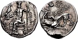 Coin of Ariarathes I. Obv: B’L GZYR (“Baal [of] Gaziura” in Aramaic), Baal seated. Gaziura mint. 333-322 BC