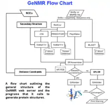 A flow chart describing the processing logic used in GeNMR is shown on the right. GeNMR makes use of a number of well-known programs and databases. These include Proteus2 to perform structural modeling, PREDITOR to calculate torsion angles from chemical shifts, PPT-DB for comparative modeling and alignment and CS23D to calculate protein structures from chemical shifts only. GeNMR also uses several well-known external programs, including Rosetta for ab initio folding without NOEs and XPLOR-NIH for NOE-based simulated annealing and refinement. A more complete list of GeNMR sub-programs is listed on the CS23D page.