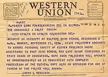 The white supremacist Bryant Bowles raised $6,000 and founded the National Association for the Advancement of White People (NAAWP) to oppose the ruling. Bowles briefly attracted nationwide attention for leading a pro-segregation boycott of previously all-white Milford High School. On September 27, 1954, as eleven black students were preparing to enroll at the school, unrest from angry townspeople was feared to be imminent. In response, Louis Redding issued an urgent telegram to Delaware Governor J. Caleb Boggs requesting the presence of state police officers "adequate to assure personal safety of eleven children whose admittance to that school last night was confirmed by state board of education." Redding closed his telegram with an optimistic line: "Hope also no occasion for powers of the police will arise." A mass meeting in Milford held in October of that year attracted a crowd of 3,000 people.[1][2] Bowles encouraged a boycott to protest the integration of Delaware schools.[3][1] Only 456 out of 1562 Milford High School students attended the next day, and the movement gained traction in the nearby town of Lincoln, where 116 of the 146 pupils in the local elementary school boycotted in solidarity.[1] Mass protests continued in Milford; the school board eventually ceded to the protestors, expelling the black students.[1][3] Several weeks later, Bowles was arrested for "conspiring to violate the state education law by leading a boycott at Milford’s integrated high school". The Attorney General later took action to revoke the NAAWP's corporate charter in September 1955.[3][2] However, the ensuing unrest, which included cross burnings, rallies, and pro-segregation demonstrations, contributed to desegregation in most of Southern Delaware being delayed for another ten years. School segregation in the state would not end until 1967.[4]