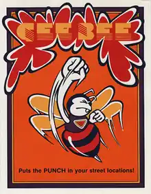 In 1977, Toru Iwatani joined Namco, shortly after graduating college.[5] Before the arrival of Iwatani, Namco was in the midst of publishing Atari arcade games in Japan, following their acquisition of Atari Japan a few years prior.[5] Iwatani had wanted to create pinball machines as opposed to video games; however, Namco higher-ups disapproved of his idea. As a compromise of sorts, Iwatani was allowed to instead create a video game based on the concept of pinball, akin to Atari's Video Pinball dedicated console, intermixed with the gameplay elements established in Breakout.[5] Ishimura would assist with programming.[6] Due to hardware limitations, strips of cellophane were applied to the monitor to compensate for the lack of color.[7][1] The actual layout of the game board is made to resemble a human face.[2] The game was named after the Japanese word for carpenter bee, "kumanbachi",[1] and used the same font type from Atari's unreleased arcade title Cannonball from 1976.[8] Gee Bee was first released in Japan in October 1978.[4] That same year, Gremlin Industries licensed the game outside Japan.[9]
