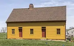 Geeting Farm is a historic home located at Keedysville, Washington County, Maryland, United States. It is a two-story, five-bay log dwelling resting on low fieldstone foundations, with a one-story, three-bay stone addition. Numerous sheds and outbuildings are located near the house.[2] The house was built by George Adam Geeting [1741-1812], who settled on this land near Little Antietam Creek after immigrating to the English Colony of Maryland in 1759 from his native Prussia. Geeting farmed his land and taught in a log schoolhouse nearby which became a regular preaching appointment for services held by Rev. Philip William Otterbein, one of the founding leaders of the United Brethren in Christ, the first denomination organized in the United States of America. In the mid-1770s, Geeting erected a meetinghouse which later became known as Mount Hebron Church, the first structure built expressly for services of the future United Brethren in Christ denomination. Salem United Methodist Church in Keedysville is the successor to the Mount Hebron Church and Geeting Meetinghouse.[3] Getting himself was ordained a minister of the German Reformed Church in 1788 and traveled extensively through Western Maryland, Virginia, and Pennsylvania as an itinerant preacher. On September 25, 1800, George Adam Geeting attended the first conference of the United Brethren in Christ at the home of Peter Kemp near Frederick, Maryland. It was at this conference that the United Brethren in Christ was formally organized as a denomination and took its name. Geeting continued serving as a minister for the new church, acted as secretary of the denominational conference, and served as a bishop of the United Brethren in Christ briefly in 1812 before his death.[4]