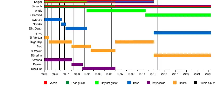 - Dolgar – bass (2000–2012), keyboards (2006–2012), vocals (1993–2012), rhythm guitars (1993–2000)