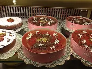 It is commonly considered an inheritance of Arab influence, and a dessert derived from the Persian fālūdhaj.[4][5] Basic ingredients are watermelon pulp, sugar (or honey) and starch, while pistachios, candied fruit, cinnamon and rose water are often added.[4][6]