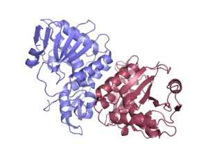 Gelonin is a 30 kDa protein.[2] Gelonin is a dimer, consisting of two identical monomers. Each monomer is composed of 251 amino acids, for a total of 502 residues. Gelonin is classified as an (α + β) protein, as its secondary structure consists of both beta sheets and alpha helices. Each monomer’s first 100 amino acids form 10 beta sheets, while their last 151 amino acids form 10 alpha helices. Gelonin’s two dimers are stabilized by hydrophobic interactions and hydrogen bonds. Specifically, the Asn22, Arg178, Asn180, and Lys237 residues of each monomer hydrogen bond with each other to stabilize the molecules. Likewise, the hydrophobic residues Tyr14, Ile15, Val16 and Pro38 from one monomer form hydrophobic interactions with the same residues in the adjacent monomer to further stabilize the dimer.[3]
