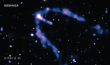 Geminga /ɡəˈmɪŋɡə/ is a gamma ray and x-ray pulsar source thought to be a neutron star approximately 250 parsecs[1] (around 800 light-years) from the Sun in the constellation Gemini.