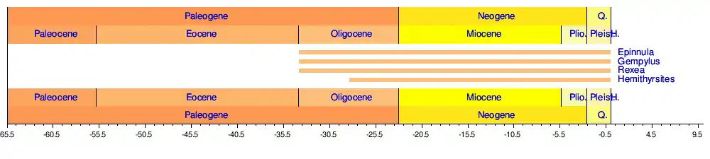 - Euzaphlegidae, an extinct group of relatives from Paleocene to Late Miocene-aged marine strata of Europe, the Caucasus Mountains,[3] India, Iran, Turkmenistan, Italy,[4] and Southern California.[5]