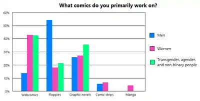 A 2015 study by David Harper concluded that webcomics were vastly more popular format to female, transgender, and non-binary comic artists than for men. More than 40% of the women, transgender, and non-binary comic artists reported to work primarily in webcomics in this study, while only 15% of men did. Harper suggested that this may be because the self-published nature of webcomics form a lower barrier to entry, while traditional mediums such as comic books are gatekept by cisgender men, though he also suggested that this disparity may just be a difference in interest between the groups.[2]
