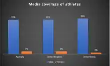 In Australia, female's sports make up 7% of all sports media coverage, the same as the United Kingdom. Similarly, in the United States, nearly 40% of athletes are female, but they own 4% of media coverage.[18] In a 2015 study, Billings and Young compared coverage of women's sports on ESPN's Sports Center and Fox Sports 1's Fox Sports Live, in which both TV programs were found to cover women's sports less than 1% of the time.[19] In the Nordic welfare states women obtain 10% of routine newspaper or TV sports coverage.[20] A 2015 analysis of International sports news websites found the three websites covering the most female athletics dedicated 7% of coverage.[21]
