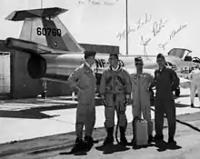 Students who flew the NF-104A while Deatrick commanded the school include Robert Lilac, Harry Blot, and Mike Loh.[38] Student flights lasted only a few more years. Aircraft 56-0756 was scrapped after an inflight rocket motor explosion occurred in June 1971 and training was terminated in December of that year.[39] As of 2016, the surviving NF-104, 56-0760, stands as a static model just outside the entrance of the USAF Test Pilot School.[40]