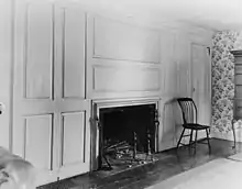 The Lincoln House stands a short way west of Hingham's central business district, just west of a triangular park formed at the junction of North and Lincoln Streets. It is a 2+1⁄2-story wood-frame structure, seven bays wide, with a side-gable roof, two interior chimneys, and clapboard siding, and rests on a granite foundation.[2] Its main entrance is in the center of the south-facing facade, topped by a simple flat corniced pediment. The entrance opens into a central hall with stairs to the second floor. To its right are the main parlor in the front, with two smaller rooms behind, traditionally described as its 1637 kitchen and borning room. These rooms have paneled walls around the fireplaces, with that in the parlor decorated with blue Delft tile. To the left of the central hall is the former entry vestibule, with a winding staircase, and the 1715 dining room, also with a fully paneled fireplace wall. The house's 1715 kitchen is behind this room. There are a total of seven staircases, and there are seven bedrooms on the second floor.[4]