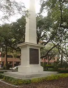 Greene fell ill on June 12, 1786, and he died at Mulberry Grove on June 19, 1786, at the age of 43.[82] The official cause of death was sunstroke. For over a century, his remains were interred at the Graham Vault in Colonial Park Cemetery in Savannah, alongside John Maitland, his arch-rival in the conflict.[83] On November 14, 1902, through the efforts of Rhode Island Society of the Cincinnati President Asa Bird Gardiner, his remains were moved to a monument in Johnson Square in Savannah.[84] Greene Square, about a third of a mile southeast of Johnson Square, was named for him upon its platting in 1799.[85]