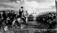The Continental Army, further diminished by expiring short-term enlistments, and by January 1776 reduced by half to 9,600 men, had to be supplemented with the militia, and was joined by Knox with heavy artillery captured from Fort Ticonderoga.[119] When the Charles River froze over, Washington was eager to cross and storm Boston, but General Gates and others were opposed to untrained militia striking well-garrisoned fortifications. Washington reluctantly agreed to secure the Dorchester Heights, 100 feet above Boston, in an attempt to force the British out of the city.[120] On March 9, under cover of darkness, Washington's troops brought up Knox's big guns and bombarded British ships in Boston harbor. On March 17, 9,000 British troops and Loyalists began a chaotic ten-day evacuation of Boston aboard 120 ships. Soon after, Washington entered the city with 500 men, with explicit orders not to plunder the city. He ordered variolation against smallpox to great effect, as he did later in Morristown, New Jersey.[121] He refrained from exerting military authority in Boston, leaving civilian matters in the hands of local authorities.[122][lower-alpha 11]