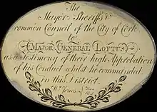 Loftus was appointed as ADC to successive Lords Lieutenant of Ireland from 1778 until 1783. He forged life-time friendships in this office,[14] seen as "a good officer and so respectable in his character and connexxions".[15] Loftus returned to active duty in the 3rd Regiment of Guards purchasing a company in 1784, and served as Lt-Colonel [14] based in London. He moved his family to Norfolk in 1790 (ibid.) and in 1794, raised the 24th Light Dragoons, appointed Brevet Colonel of that regiment[16][17](portrait left). In 1796, Loftus was made a Major General on the English staff[14] and was sworn in as a Member of the Irish Parliament for Lord Ely and returned to Westminster as member for Great Yarmouth for Lord Townshend in the same year.[18] Loftus was removed to the Irish staff in 1797 at the request of Lord Camden[19] and appointed to be Commander in Chief in Munster based in Cork. He reported back to Camden that the Catholics of Munster were in favour of "good order and government" and that if he wanted to root out sedition, he should look at "Dublin or the North".[20] Loftus left the grateful citizens of Cork in 1798 to take command of Laughlinstown camp.[21][22] In the same year, he commanded a brigade at the battle of Vinegar Hill[23] and presided over a military court at the trial of Wolfe Tone.[24]