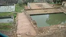 One part of this hydraulic complex, the Albercones, consists of a medieval water tank which could hold 400 cubic meters and allowed for the irrigation of higher orchards and gardens. It is located on the hillside above the Jardines Nuevos today. Two more modern reservoirs also exist next to it today: one built by Torres Balbas in 1926, and another added by Prieto Moreno in the 1930s.[14] The reservoir was supplied with water through a well 17.4 meters deep located on a platform on its southwest side, which was originally covered by a rammed-earth tower inside which was an animal-powered water-wheel mechanism that drew water from the well. The well leads to an underground gallery or channel whose lower opening is near the present-day Paseo de las Adelfas. This underground gallery drew water directly from the Acequia Real as it flowed past the gardens, as well as from the higher Acequia del Tercio which intersected it. Both canals continue past the Albercones and join together before turning back towards the Alhambra, where the water enters via an aqueduct next to the Torre del Agua at the Alhambra's east end.[14]