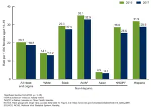 A report by demographer William Frey of the Brookings Institution stated that in the United States, the Millennials are a bridge between the largely Caucasian pre-Millennials (Generation X and their predecessors) and the more diverse post-Millennials (Generation Z and their successors).[102] Frey's analysis of U.S. Census data suggests that as of 2019, 50.9% of Generation Z is white, 13.8% is black, 25.0% Hispanic, and 5.3% Asian. (See figure below.)[103] 29% of Generation Z are children of immigrants or immigrants themselves, compared to 23% of Millennials when they were at the same age. As of 2019, 13.7% of the U.S. population is foreign-born, compared to 9.7% in 1997, when the first members of Generation Z had their birth cries.[104] Indeed, according to the Pew Research Center, in spite of the diminished flow of immigrants to the United States following the Great Recession, Generation Z is the most ethnically diverse yet seen. 52% of this generation is white. 25% is Hispanic. 14% is black, and 4% is Asian.[5] Approximately 4% is multiracial,[5] and this number has risen rapidly between 2000 and 2010.[105] More specifically, the number of Americans who identify as mixed white and black has grown by 134% and those of both white and Asian extraction by 87%.[105] For comparison, 44% of Millennials, 40% of Generation X, and 28% of the Baby Boomers identify as non-white.[106] Research by the demographer Bill Frey suggests that at the national level, Hispanics and Asians are the fastest-growing racial minority groups in the United States while the number of Caucasians under the age of 18 has been declining since 2000.[107] Overall, the number of births to Caucasian women in the United States dropped 7% between 2000 and 2018. Among foreign-born Caucasian women, however, the number of births increased by 1% in the same period. Although the number of births to foreign-born Hispanic women fell from 58% in 2000 to 50% in 2018, the share of births due to U.S.-born Hispanic women increased from 20% in 2000 to 24% in 2018. The number of births to foreign-born Asian women rose from 19% in 2000 to 24% in 2018 while that due to U.S.-born Asian women went from 1% in 2000 to 2% in 2018. In all, between 2000 and 2017, more births were to foreign-born than U.S.-born women.[108]