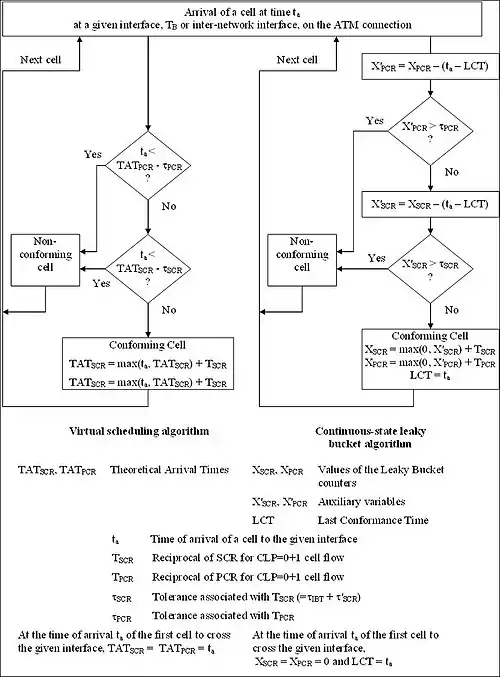 The GCRA is described by the ATM Forum in its User-Network Interface (UNI)[1] and by the ITU-T in recommendation I.371 Traffic control and congestion control in B-ISDN .[2] Both sources describe the GCRA in two equivalent ways: as a virtual scheduling algorithm and as a continuous state leaky bucket algorithm (figure 1).
