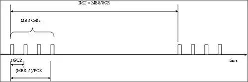 This may be best understood where the transmission on an VBR VC is in the form of fixed length messages (CPCS-PDUs), which are transmitted with some fixed interval or the Inter Message Time (IMT) and take a number of cells, MBS, to carry them; however, the description of VBR traffic and the use of the dual leaky bucket are not restricted to such situations. In this case, the average cell rate over the interval of IMT is the SCR (=MBS/IMT). The individual messages can be transmitted at a PCR, which can be any value between the bandwidth for the physical link (1/δ) and the SCR. This allows the message to be transmitted in a period that is smaller than the message interval IMT, with gaps between instances of the message.