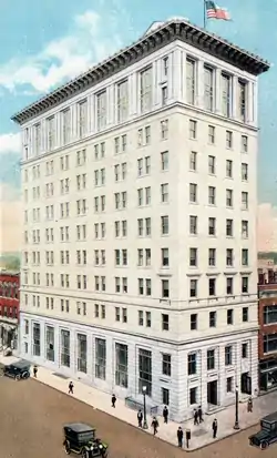 The Genesee County Savings Bank was founded in 1872. In 1915, the bank opened a new headquarters at the corner of Kearsley and Saginaw Streets.[2] In 1916, the bank consolidated some business aspects with the First National Bank of Flint. Due to Flint's booming economy, both banks were outgrowing their headquarters, and in 1919, Genesee County Savings Bank constructed this new building only a block from their old headquarters. The building was designed by Hodgson Brothers of New York City.[3] Over the rest of the 1920s, the bank grew tremendously, and in 1957 merged with Merchants & Mechanics Bank to form Genesee Merchants Bank & Trust Co.[4] The bank moved its headquarters to Genesee Towers in 1968.