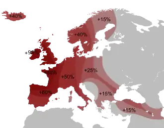 In Italy as elsewhere in Europe the majority of mtDNA lineages belong to the haplogroup H. Several independent studies conclude that haplogroup H probably evolved in West Asia c. 25,000 years ago. It was carried to Europe by migrations c. 20–25,000 years ago, and spread with population of the southwest of the continent.[46][47] Its arrival was roughly contemporary with the rise of the Gravettian culture. The spread of subclades H1, H3 and the sister haplogroup V reflect a second intra-European expansion from the Franco-Cantabrian region after the last glacial maximum, c. 13,000 years ago.[46][48]