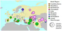 Computing the frequency of common point mutations of several mtDNA Thracian remains from South-East of Romania with haplogroups H17, H22 and HV has resulted that the Italian (7.9%), the Albanian (6.3%) and the Greek (5.8%) have shown a bias of closer genetic kinship with the Thracian individuals than the Romanian and Bulgarian individuals (4.2%), but it was noted that more mtDNA sequences from Thracian individuals are needed in order to perform a complex objective statistical analysis.[68] From seven Thracian samples aged about 3 millennia from Gabova Mogila and Shekerdja Mogila in Sliven Province, and from Bereketska Mogila in Stara Zagora Province, two were identified as belonging to mtDNA Haplogroup D, presumably associated with East Asia. Haplogroup W5a was found among two individuals and H1an2. H14b1 was also found.[69] Four samples from Iron Age Bulgaria were studied, the official study confirmed only that the two are male and mtDNA of two individuals - U3b for the Svilengrad man and HV for the Stambolovo individual. Haplogroups U for the Krushare man, U2e for the Vratitsa individual have been identified. Those individuals were from Thracian burial sites and are dated at around 450-1500 BC.[70]