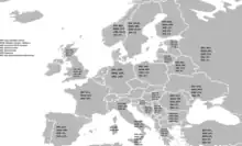 The national groups of Eastern Europe are characterized by dominant haplogroups R1a or I2, while those of Western Europe are characterized by dominant haplogroups R1b or I1, and by other dominant haplogroups in Europe are characterized Albanians, Finns, Greeks, and Turks, and over 50% of the total pool of each European nation other than the latter consists of these 4 haplogroups.[8] A consistent pattern of both all national and regional groups of Bulgarians and Balto-Slavs is that their sum of haplogroups R1a and I2 is always larger than their sum of R1b and I1, while this ratio is vice versa in the Europeans not native to the Post-Eastern Bloc.[8] Bulgarians, as some of their neighbours show the highest diversity of haplogroups in Europe, marked by significant (> 10%) frequencies of 5 major haplogroups. Most Bulgarians belong to three unrelated haplogroups, 20% of whom to I-M423 (I2a1b), 18% to E-V13 (E1b1b1a1b1a) and 17% to R-Z282 (R1a1ab1), but the biggest part belongs to macro-haplgoroup R (~28%). The major haplogroups, grouped by age of around 20 kya, are:[11]