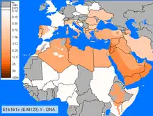 It is thought to have originated in North Africa 14,200 years ago.[32] Its parent clade E1b1b (E-M215) is believed to have first appeared in Horn of Africa about 42,600 years ago.[33]