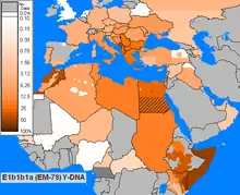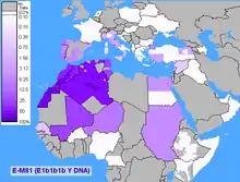 This haplogroup reaches a mean frequency of 85% in North Africa. It decreases in frequency from approximately 80% or more in some Moroccan Berber populations, including Saharawis, to approximately 28% to the east of this range in Egypt.[26][30][34]