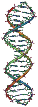 The molecular basis for genes is deoxyribonucleic acid (DNA). DNA is composed of deoxyribose (sugar molecule), a phosphate group, and a base (amine group). There are four types of bases: adenine (A), cytosine (C), guanine (G), and thymine (T). The phosphates make hydrogen bonds with the sugars to make long phosphate-sugar backbones. Bases specifically pair together (T&A, C&G) between two backbones and make like rungs on a ladder. The bases, phosphates, and sugars together make a nucleotide that connects to make long chains of DNA.[55] Genetic information exists in the sequence of these nucleotides, and genes exist as stretches of sequence along the DNA chain.[56] These chains coil into a double a-helix structure and wrap around proteins called Histones which provide the structural support. DNA wrapped around these histones are called chromosomes.[57] Viruses sometimes use the similar molecule RNA instead of DNA as their genetic material.[58]