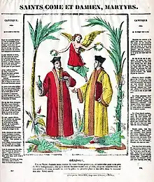 The text issues were compounded after Universal Edition of Vienna published the piano and orchestral versions in 1930. Not having the original libretto at their disposal, the editors prefaced the scores with an old French Épinal print featuring an anonymous Canticle in honor of Geneviève. Many of these popular prints had been distributed during the 19th Century, to be sung to the tune of "Due devant nous tout s'abaisse et tout tremble" ("Before us everything sinks and everything trembles") from Jean-Baptiste Lully's tragic opera Atys (1675).[29] These verses stick to the traditional legend with its lachrymose denouement (even the doe dies from heartbreak), completely at odds with the authors' intentions and the lyrics of the arias. In later editions Universal gave Contamine de Latour sole credit for the texts, leading commentators to assume he also wrote the Canticle and Daudet's poems. The Canticle itself is now almost always spoken before every performance.