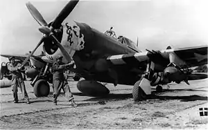 ![]() Ground personnel of the 358th Fighter Group prepare to start the engine of a P-47 Thunderbolt nicknamed "Chunky" at ALG A-90, Toul-Croix De Metz Airfield in 1944 during World War II | |
