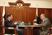 In the presidential election on 2 March 2008, Zyuganov garnered 17.76% of the vote and came in second to Medvedev's 70.23%.[14]