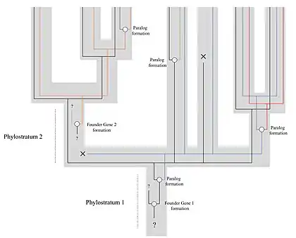 This technique relies on the assumption that the diversity of the genome is not only due to gene duplications but also to continuous frequent de novo gene births. These genes (called "founder genes") would form from non-genic DNA sequences, as well as from changes in reading frame (or other ways of arising from within existing genes), or even from very rapid evolution of the protein that would modify the sequence beyond recognition.[2] These new genes would at first have high evolutionary rates that would then slow down with time, allowing us to recognise their lineage in their descendants.[1] The founder genes can then be put in a specific phylostratum. The phylostratum is represented as the clade that includes all the genes that derive from the same founder gene, signifying that this gene was formed in the common ancestor of this clade (e.g. Arthropoda, Mammalia, Metazoa, etc.). Positioning these founder genes and their descendants on different phylostrata can allow us to age them. This can then be used to analyse the origin of certain functions of proteins and developmental processes on a macroevolutionary scale, by observing connections between certain genes as well.