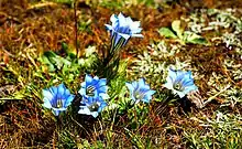 Gentiana sino-ornata, the showy Chinese gentian, is a species of flowering plant in the family Gentianaceae, native to western China and Tibet. It is a low-growing semi-evergreen perennial growing to 5–7 cm (2–3 in) tall, with multiple prostrate stems 15–30 cm (6–12 in) long, bearing single trumpet-shaped flowers of a pure blue with a white- and green-striped throat, in autumn.[3]