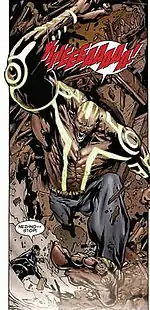 However, he cannot sustain this form for long since it causes massive strain on his body and leads to seizures. After Belasco had kidnapped the New X-Men to Limbo, Nezhno was able to protect Pixie and defeat N'astirh before passing out. The vibranium tattoos adorning his body help to keep his powers in check, but Nezhno indicated that eventually his powers may kill him.[6] When his powers are in use his vibranium tattoos glow. These tattoos are actually Vibranium-based paints that were intended to be fused with his skin.
