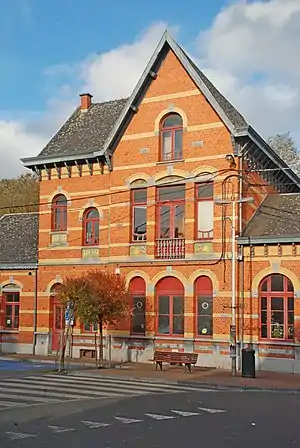 The railway station has been built by architect G. De Lulle in 1910, as attested by the inscription "Anno 1910" above the main entrance. The architectural style of the station is not Art nouveau but eclectic. The building, made of orange and yellow bricks, consists of a high central building with a low-rise extension on each side. The rear façade of the station presents a porch roof (or glass porch).