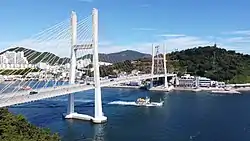 The Geobukseon Bridge (Korean: 거북선대교), also called the Second Dolsan Bridge (Korean: 제2돌산대교), is the main bridge on the Yeosu Road between Udu-ri, Dolsan and Jonghwa-dong, linking the Port of Yeosu with Dolsando across the Namhae sea.[1] The bridge is floating cable-stayed bridge with 464m (35+82+230+82+35m) length and its construction started in June 2008. It opened in April 2012 and carries four lanes of motor vehicle traffic.[2] The new link was intended to reduce traffic congestion on the First Dolsan Bridge which opened in 1985, and act as an important infra-structure link during the Yeosu Expo which had been held from May, 2012 for three months. The bridge was built by contractor Daelim Industrial Co. Ltd for client Iksan Regional Construction & Management Administration. Contract cost is US$60million, which includes a 460m long tunnel at one end, and a 280m long approach bridge.[3]